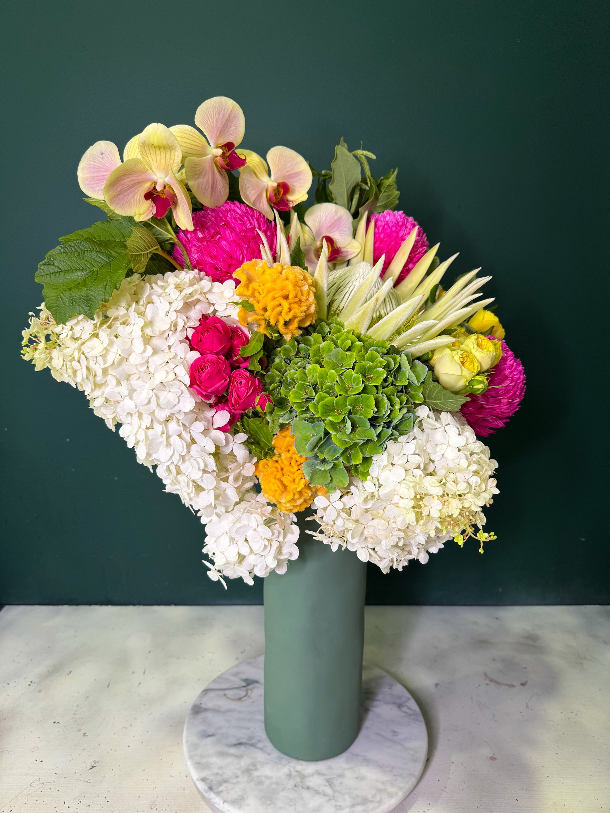 Because flowers and foliage stock are seasonal and subject to availability, flower arrangements may include similar substitutions of the same value and vary from what is depicted in the product photo