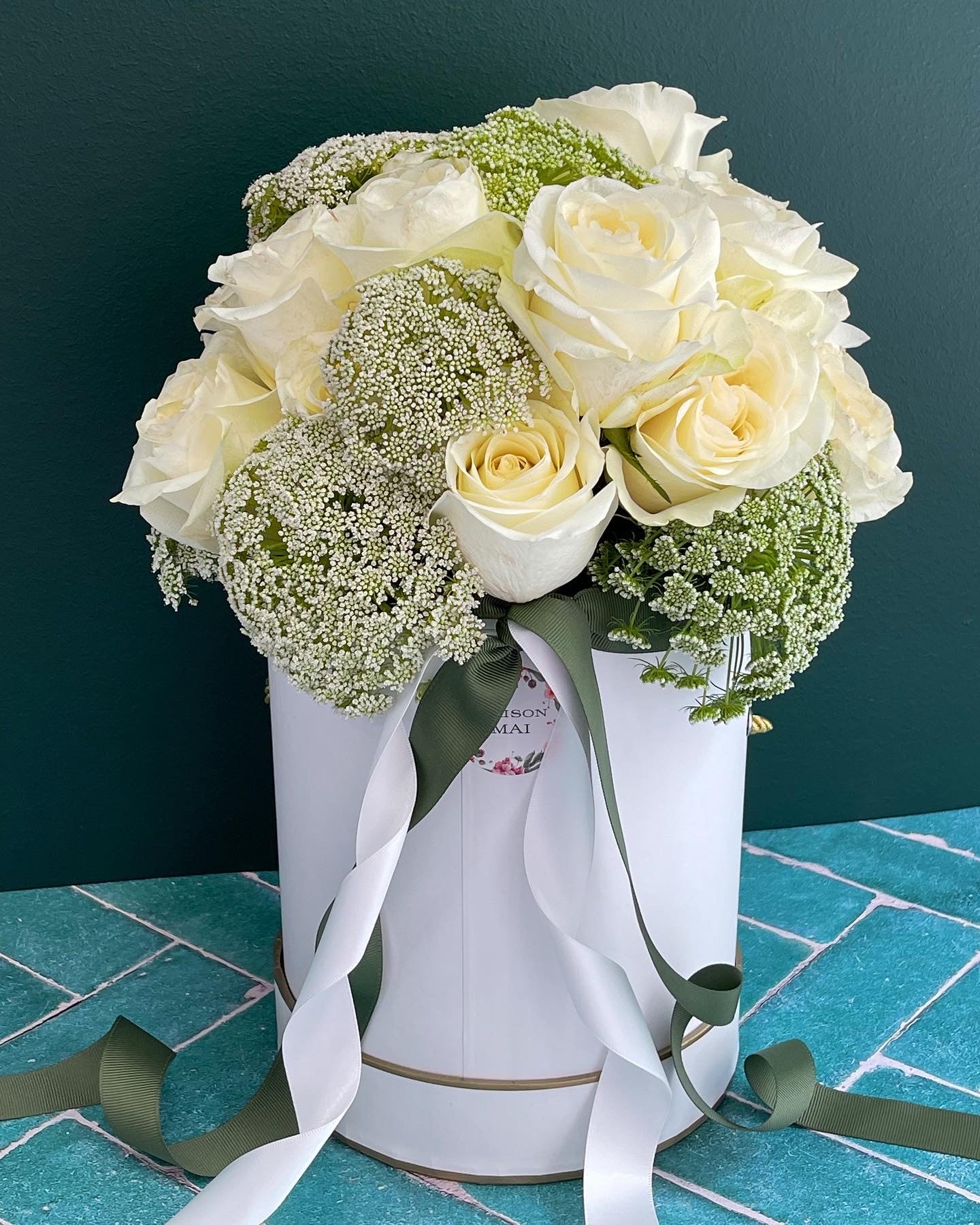 Express your feelings with flowers, show them how admired they are with stunning white Roses arranged in with greenery in hat flower box. Presented in classic white hat flower box with matching hand-tied ribbons.