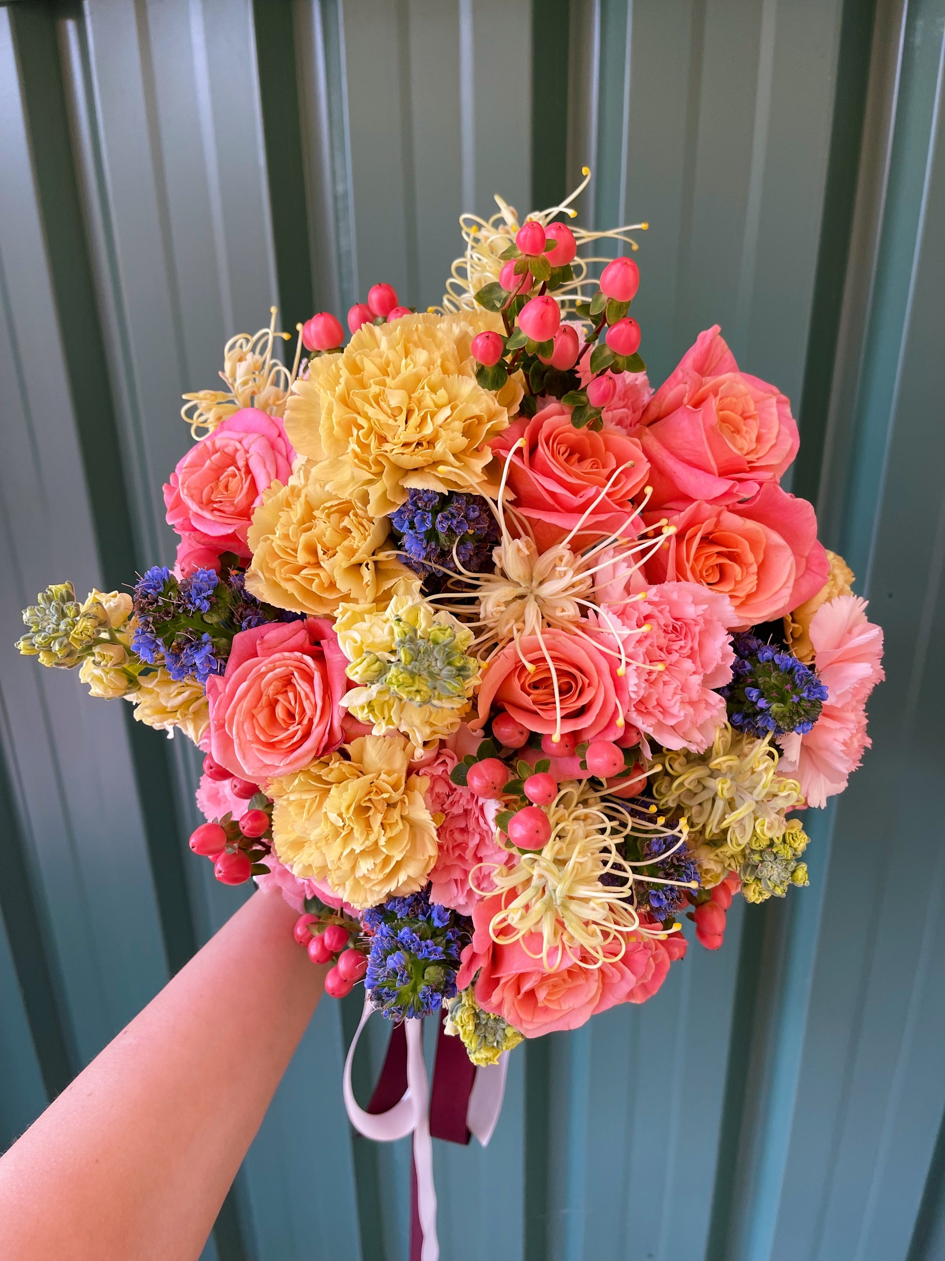 A beautiful blush and peach bouquet of roses, tulips, carnations, chrysanthemum, stock and erica flowers, and foliage. Thin lines of healing beauty in every flower arrangement.