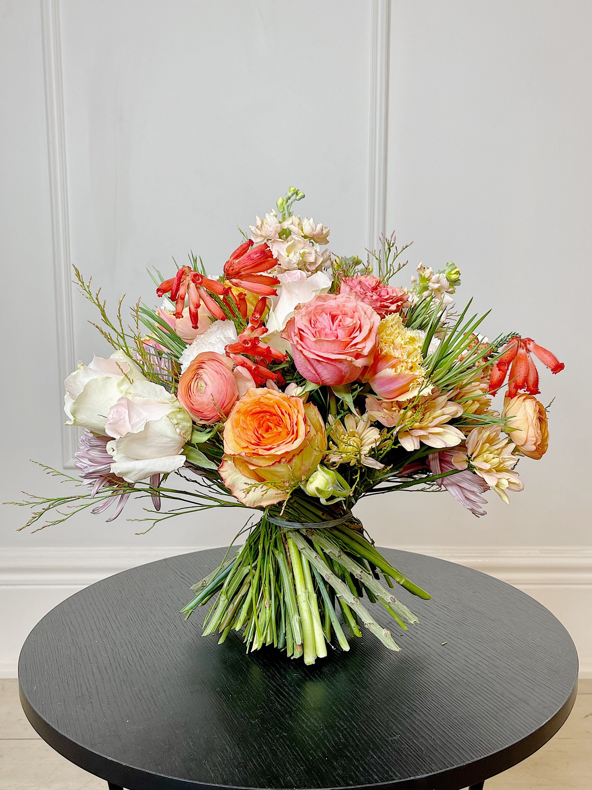 A beautiful blush and peach bouquet of roses, tulips, carnations, chrysanthemum, stock and erica flowers and foliage. Thin lines of healing beauty in every flower arrangement.