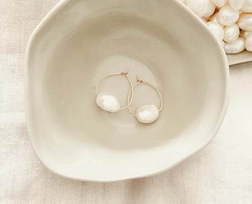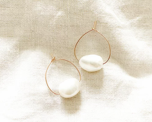 Hoop earrings made with sterling silver, yellow gold or rose gold, and one baroque freshwater pearl on each hoop, natural (white) in colour. Freshwater pearls are natural and have a raw organic finish, their shape is unique and imperfections are common.