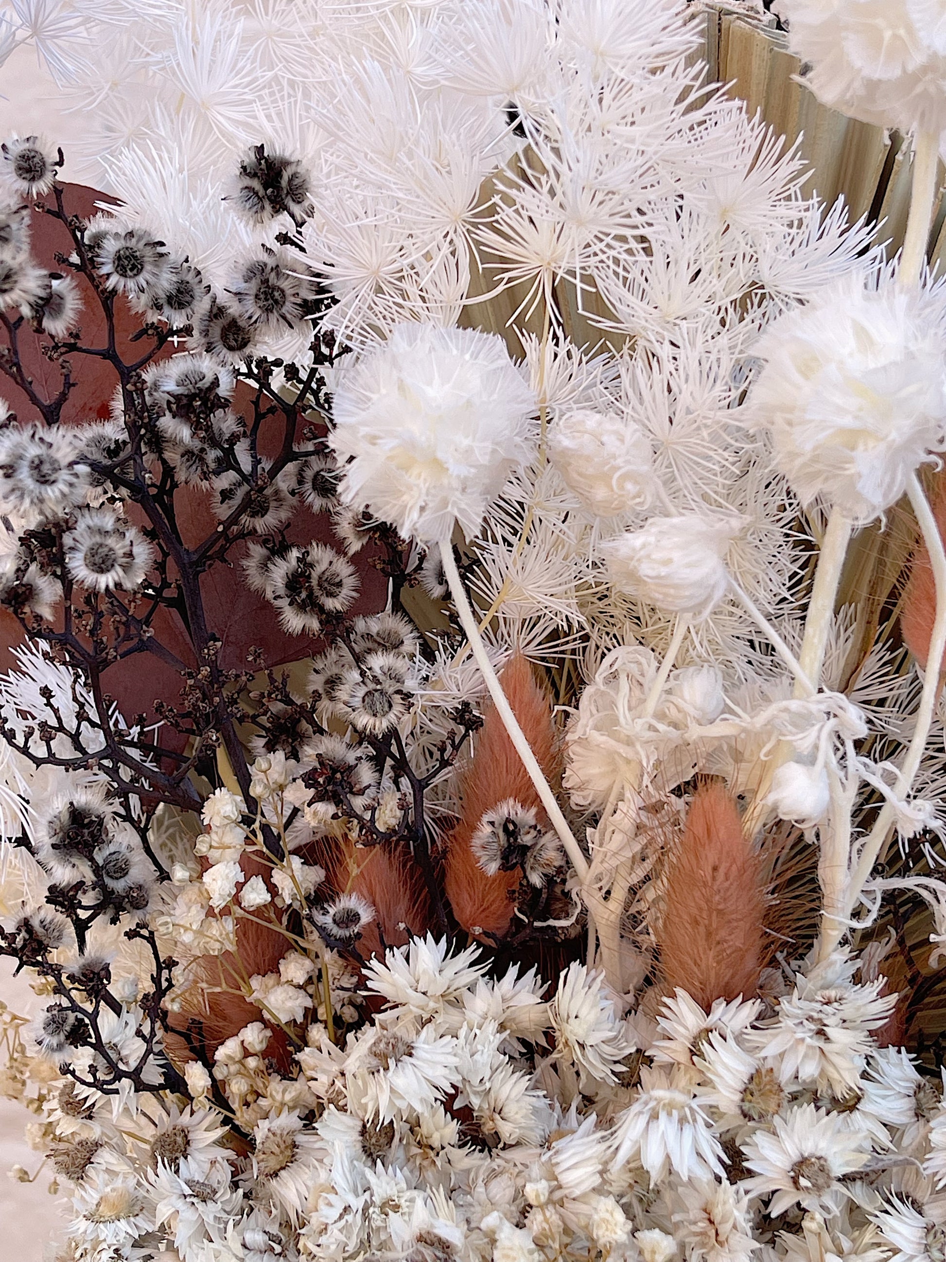 A beautiful arrangement of dried flowers including camomile and baby's breath in a ceramic vase.
