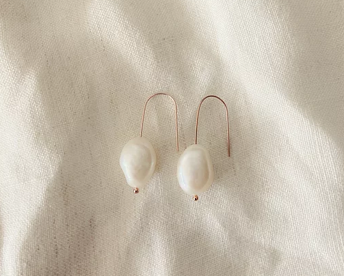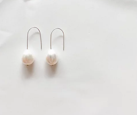 Single pearl drop earrings made with sterling silver, 14k yellow gold or rose gold and baroque freshwater pearls, natural (white) in colour. Freshwater pearls are natural and have a raw organic finish, their shape is unique and imperfections are common.