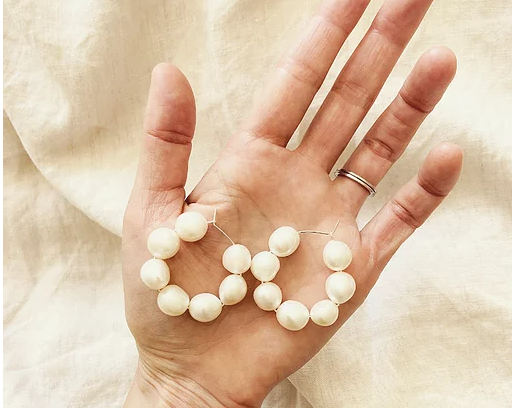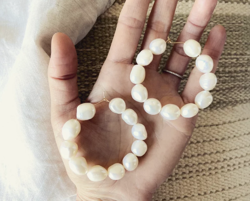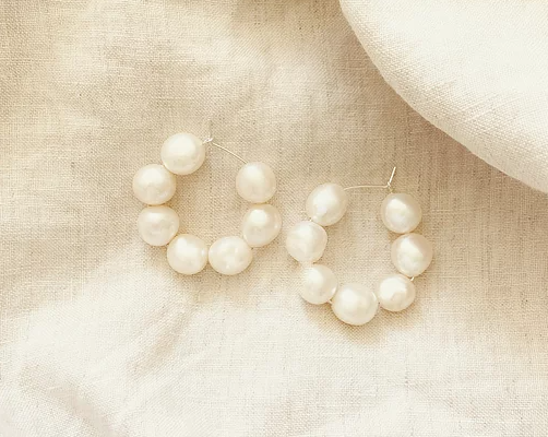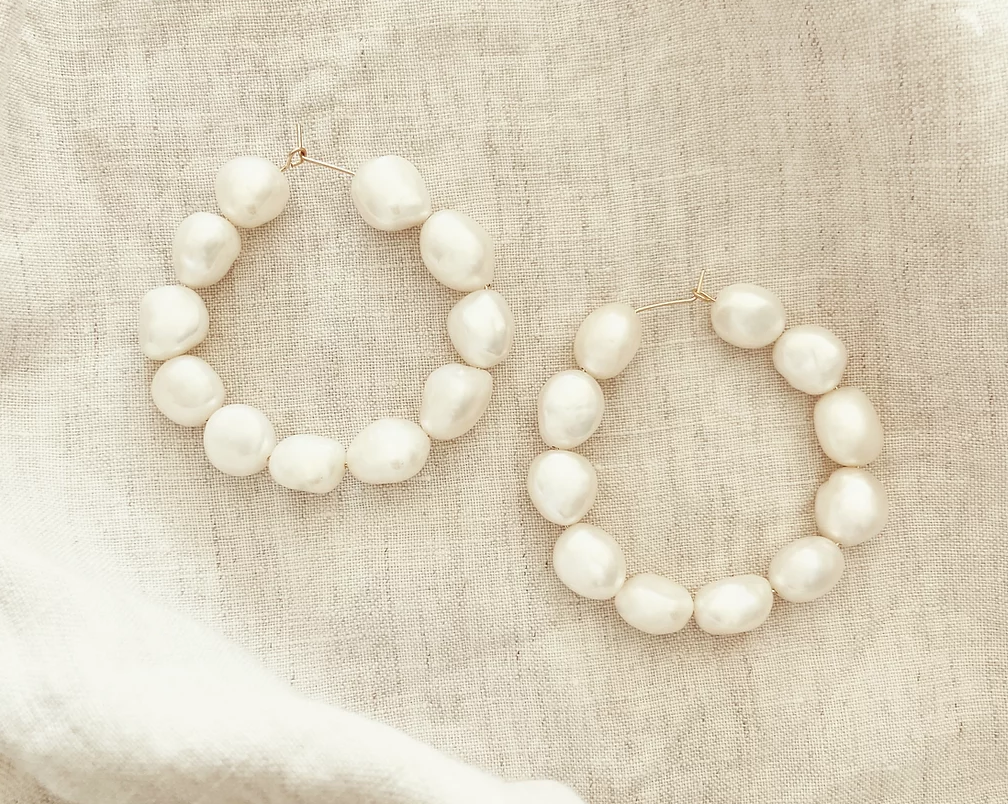 Hoop earrings made with sterling silver, 14k yellow gold or rose gold, and 10-12 baroque freshwater pearls (5cm drop), natural (white) in colour. Freshwater pearls are natural and have a raw organic finish, their shape is unique and imperfections are common.